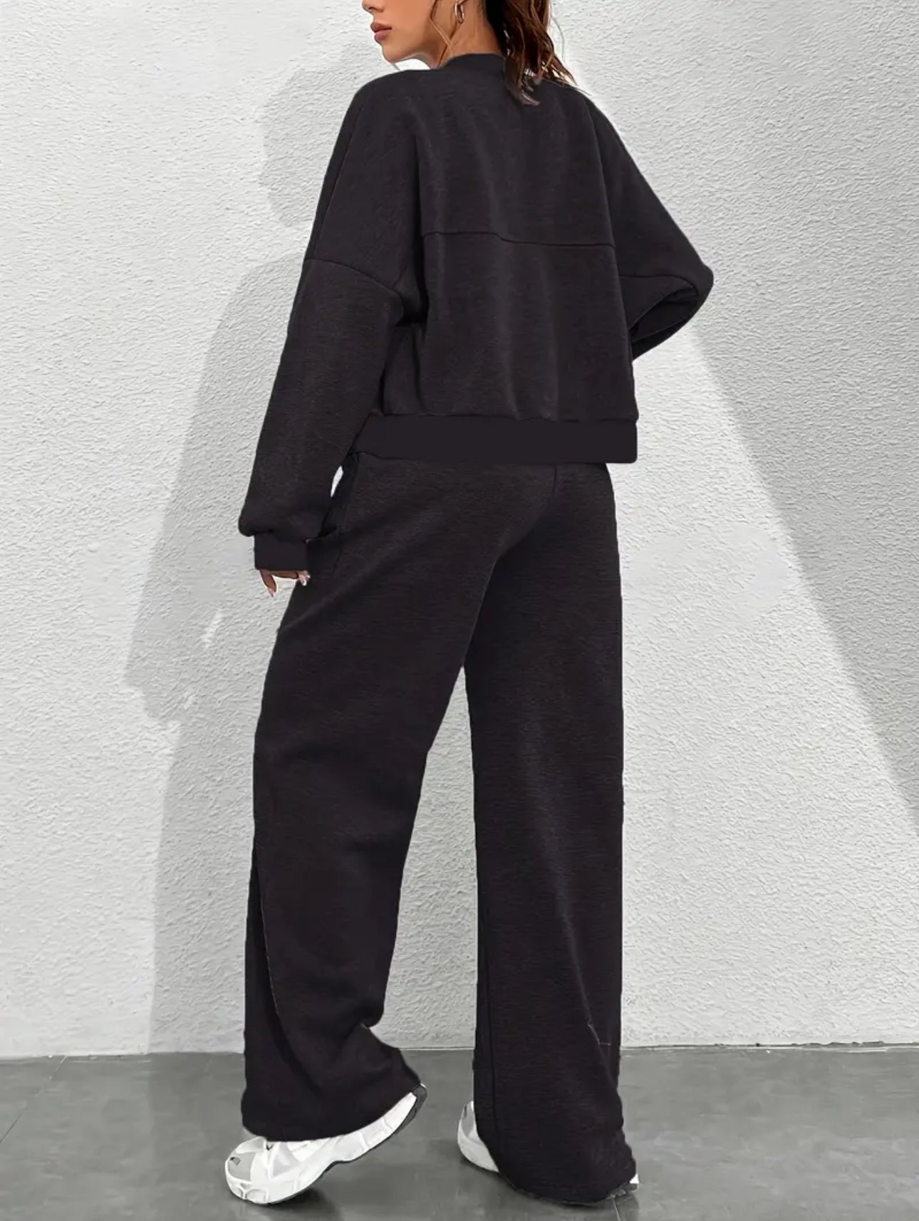 Stay cozy and chic with the TYN Women’s Plus Size KnitPulse Set! This black, long-sleeve zip-up hoodie with a sleek stand collar and metallic silver TYN logo pairs perfectly with matching high-waisted pants. Crafted from a comfy polyester blend, it’s your go-to for stylish autumn and winter casual wear. Ideal for lounging or stepping out in confidence. Shop now!