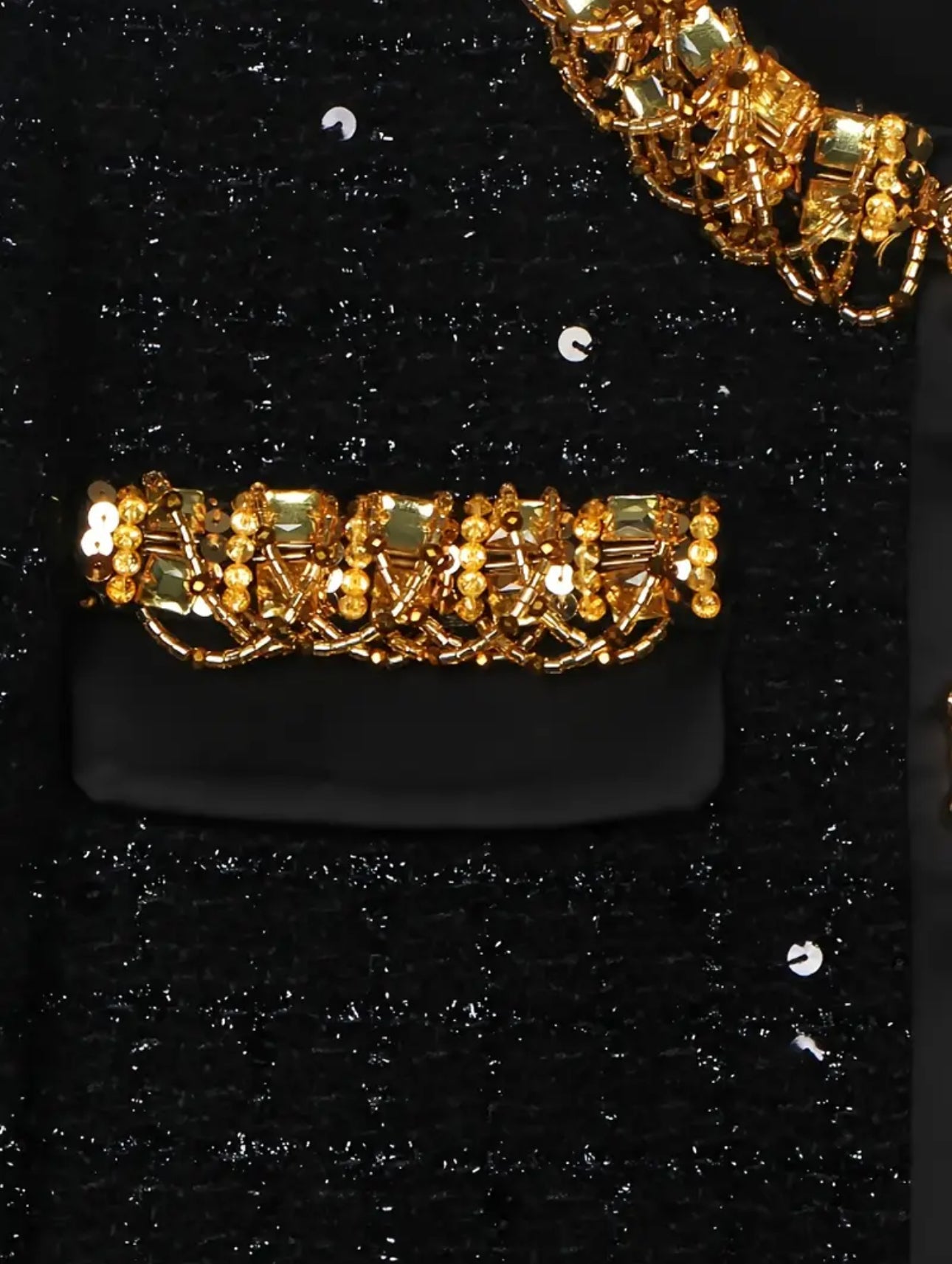 Shine bright with the Women’s Midnight Sparkle Two-Piece Set, ideal for fall and winter celebrations. This stunning ensemble features a sleeveless black dress with shimmering gold details and a matching long-sleeve jacket, crafted from a luxurious polyester blend. It’s the perfect blend of elegance and glamour for any party.
